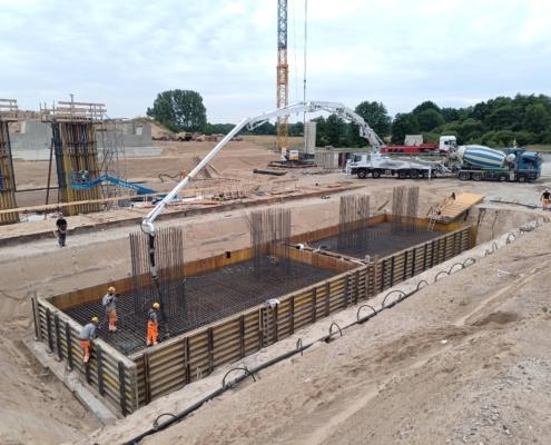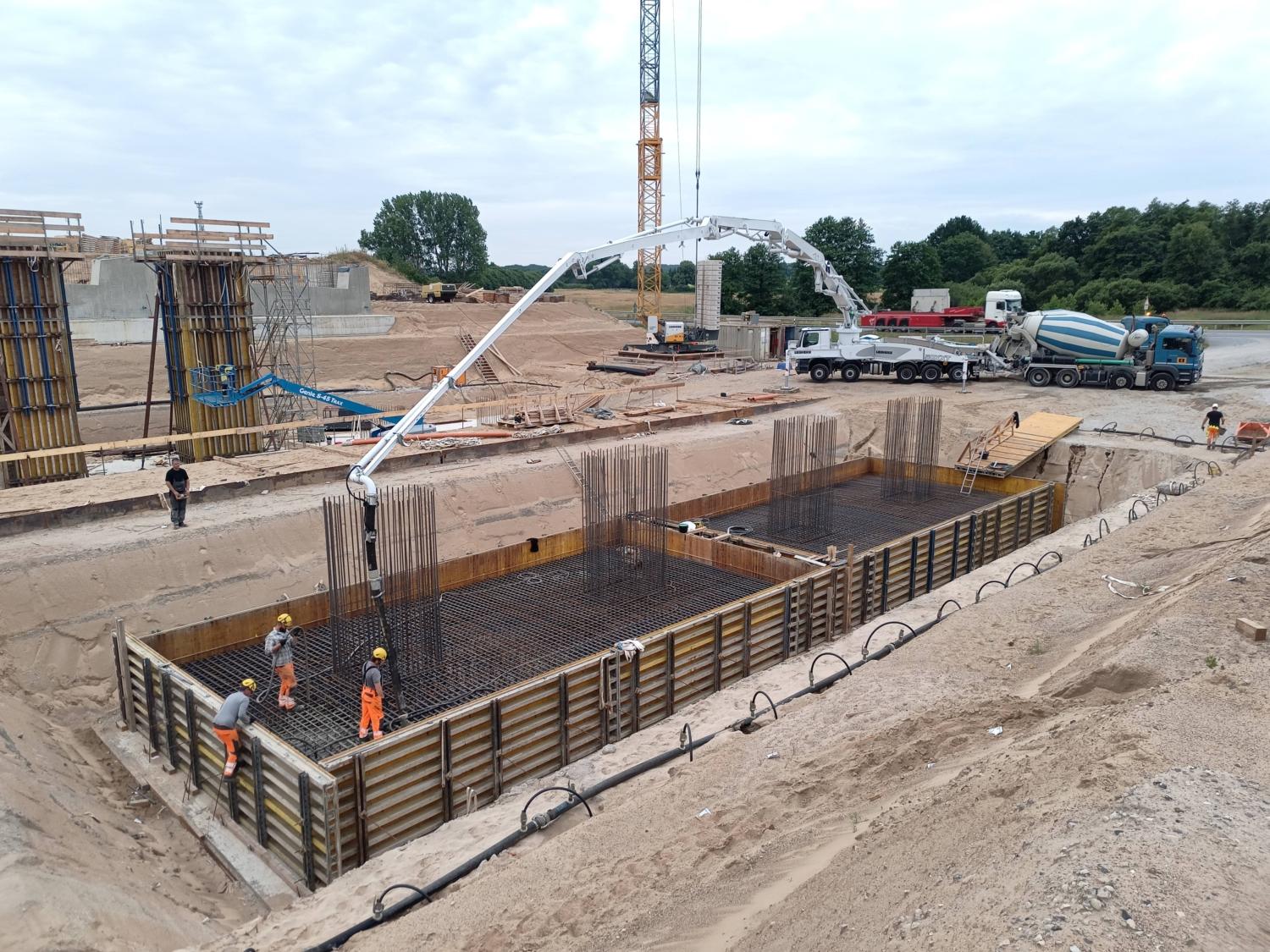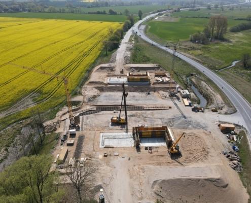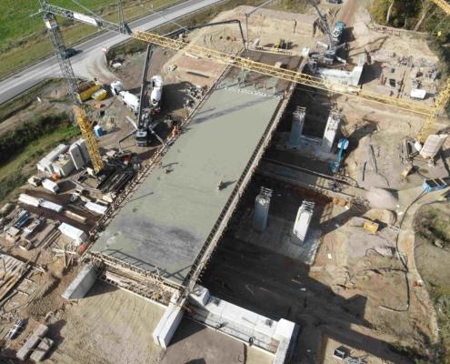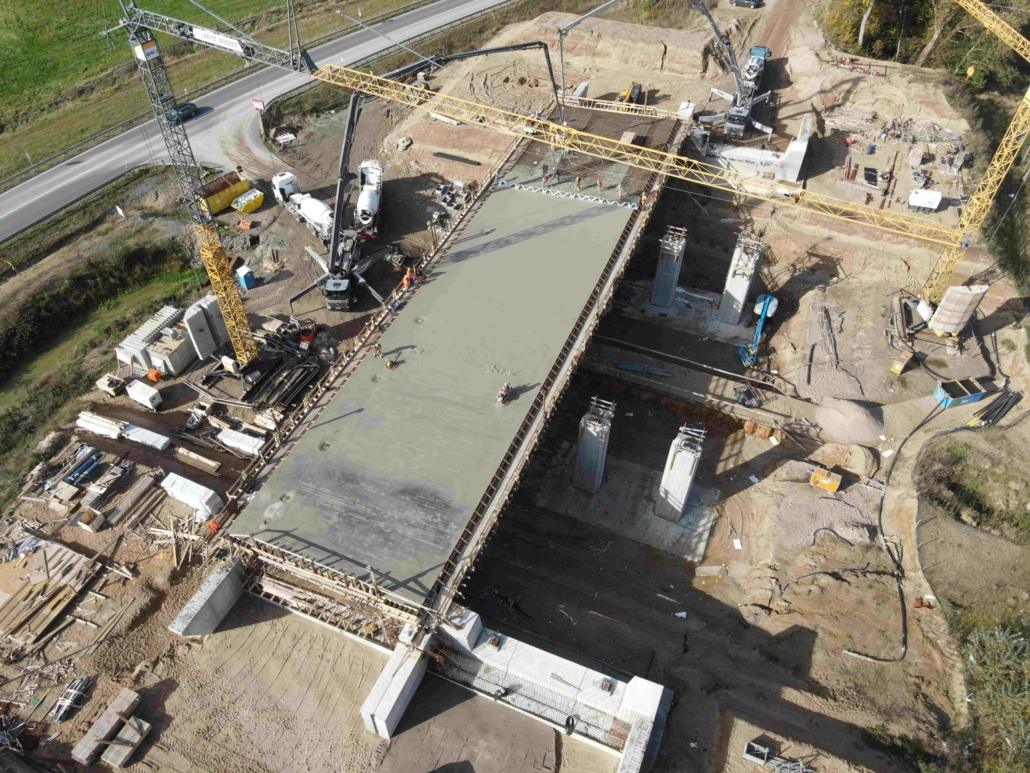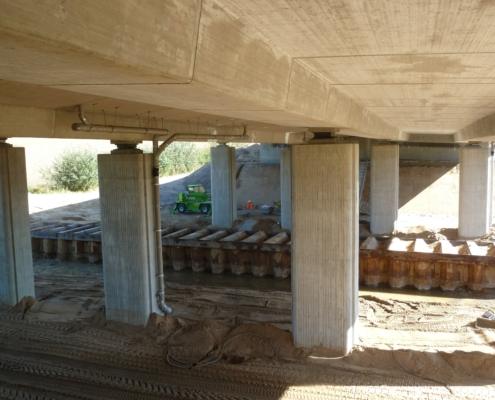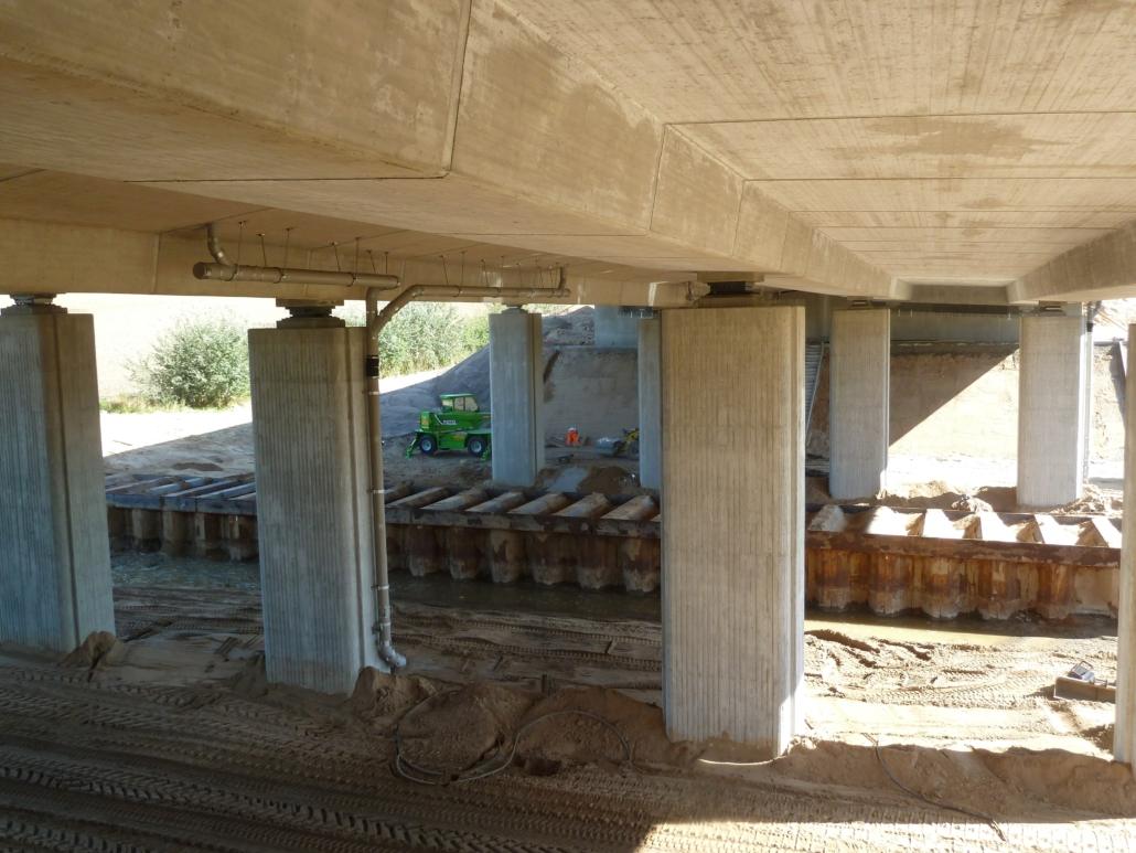 Die Ausführung erfolgte als 2-stegiger Plattenbalken mit 1,35 m Steghöhe und 0,35 m Plattendicke. Die Lasteinleitung in den Baugrund erfolgt über kastenförmige Widerlager und Mittelpfeiler mit Flachgründung.